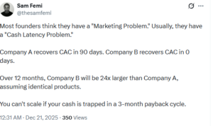 Most of you are suffocating right now because you bought into a comfortable lie called “Growth at all Costs,” a myth sold to you by a Venture Capital Industrial Complex that needs you to burn your equity to fuel their portfolio returns. They told you to burn money to acquire customers, to wait twelve agonizing months to earn that money back, and to pray that LTV would eventually save you.